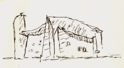 Before the war Le Corbusier saw the human race as undifferentiated objects to be fit into a massive box. His focus on science, analysis and the machine as savior was mixed with a love of classical proportion. His Unite d'Habitation was occasionally beautiful, but never humane. This sketch, on the other hand, is thoroughly human and personal; indeed, it is almost primitive.